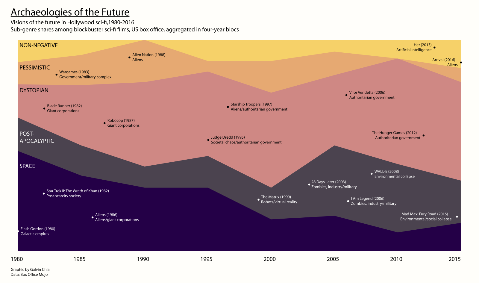 There were obviously limitations to my method. I had to initially rely on Box Office Mojo’s definitions of sci-fi, had to make judgments on what films counted as sci-fi (I chose to exclude Marvel’s superhero films, for instance), and finally had to decide on how to categorise these visions of the future. Culturally significant films which did not deal explicitly with the future, like Star Wars or Jurassic Park, were excluded as well.