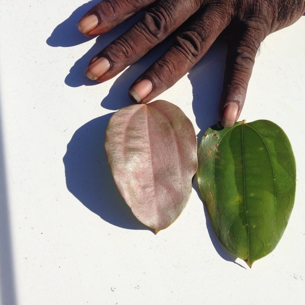 The red leaf on the left is covered with iron ore dust, the leaf on the right has been cleaned. When plants are covered with dust they can no longer photosythesise, meaning they slowly die, taking with them the culture and societies that depend on them. Photo by Sean Kerins, used with permission. Kerins writes: “The photo was “taken at Bing Bong in the Gulf of Carpentaria. It’s the loading facility for both McArthur River Mine and Western desert resources. They only operated for 18 months… until iron ore prices dropped. They promised much and delivered next to nothing.”