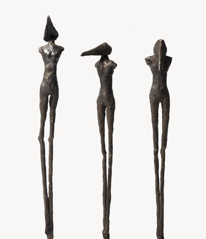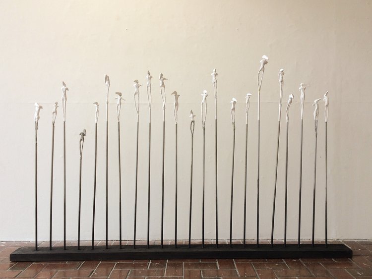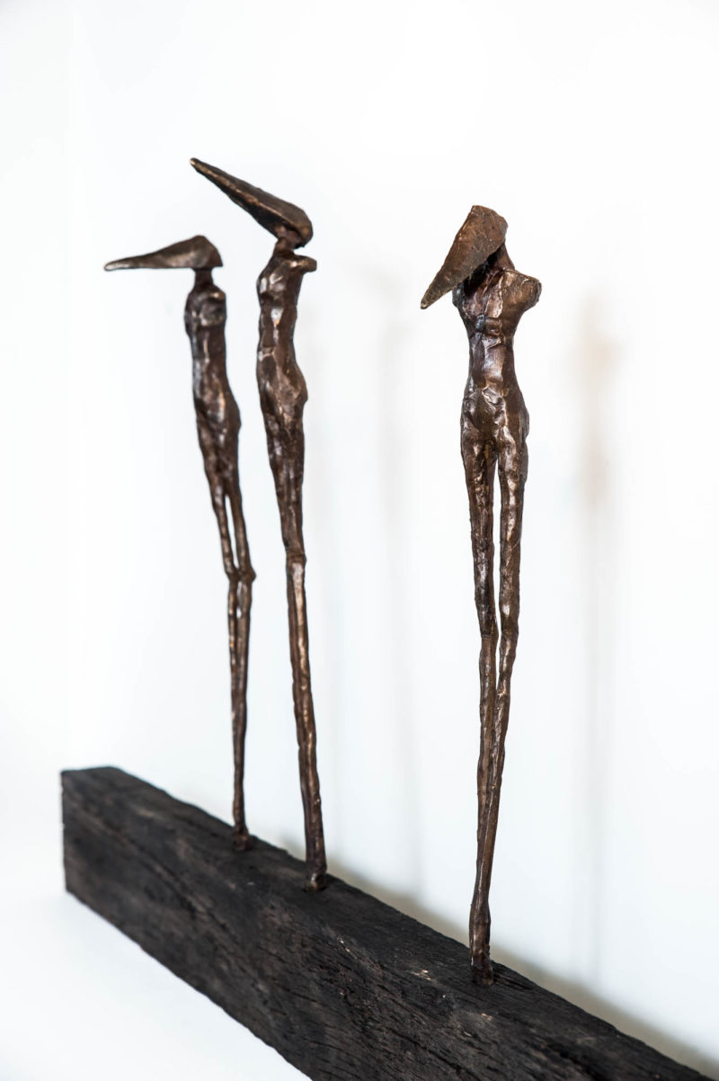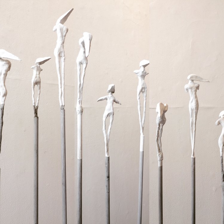 The Rise and Fall is the second in a body of work to be made under this theme. Here, the notions of vulnerability and the cost of migration are enhanced, with the solitary figures having some capacities removed through the loss of wings and arms. The legs are drawn together and restricted from movement, yet the angular heads and elongated bodies evoke emotive postures.