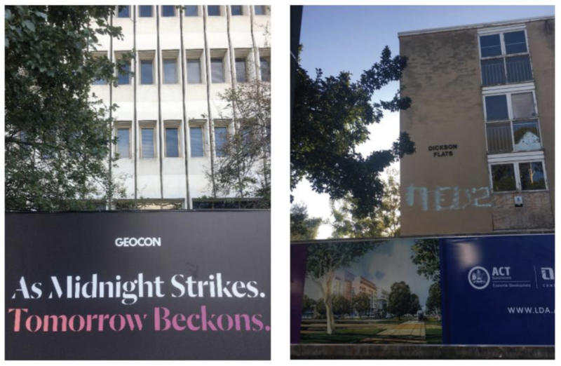Recently, the allocation of social housing to Havelock House has come under pressure again – this time, from inner-city gentrification and the growing demand for the high value land. Other social housing complexes in the area are being demolished and their residents are being moved to the far north of the Territory. Walking past the boarded-up Northbourne Flats in early Spring, Diane, one of the few remaining residents of the social housing block just up from Havelock, hurtles out of her unit. She looks harried but hopeful and, with only a brief introduction (‘Oh! You look like my son!’), goes on to talk of plans being made by a group of residents to secure funding to retain a block of the flats and build a community centre there. People are pushing back again: “Unit 16 faces Northbourne. Those kids wake up to light rail construction and an enormous wall of orange: Geocon’s Midnight Building getting a facelift. Molonglo Group is an ongoing dinner joke and an ongoing threat. Should we buy a two-year internet subscription? What if we’re not here in two years?”